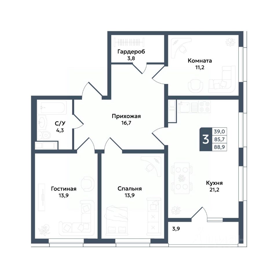 39 м² · Этаж 16 из 20