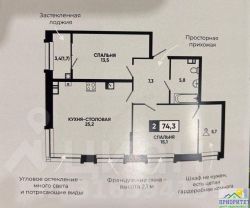 Предлагается к продаже двухкомнатная квартира, расположенная на первом этаже кирпичного дома 2014 года постройки.О квартире:* Общая площадь: 72 кв. м.* Планировка: просторная кухня, две изолированные комнаты.* Ремонт: выполнен качественный ремонт.* Коммуникации: установлено индивидуальное отопление. Система ''теплый пол'' смонтирована в кухне, прихожей и ванной комнате. О доме и придомовой территории:* Материал стен: кирпич.* Паркинг: к квартире прилагаются два парковочных места с возможностью монтажа навеса. * Благоустройство: во дворе оборудована детская площадка.Расположение и инфраструктура: Объект находится в районе с развитой инфраструктурой. В шаговой доступности расположены:* Магазины и торговый центр.* Остановки общественного транспорта.* Школа и детский сад.* Спортивный зал и кафе.Курортная зона находится в 15 минутах ходьбы.Документы готовы к сделке. Для организации просмотра и получения дополнительной информации просим обращаться по указанному номеру телефона. Код пользователя: 179170Номер в базе: 9092251