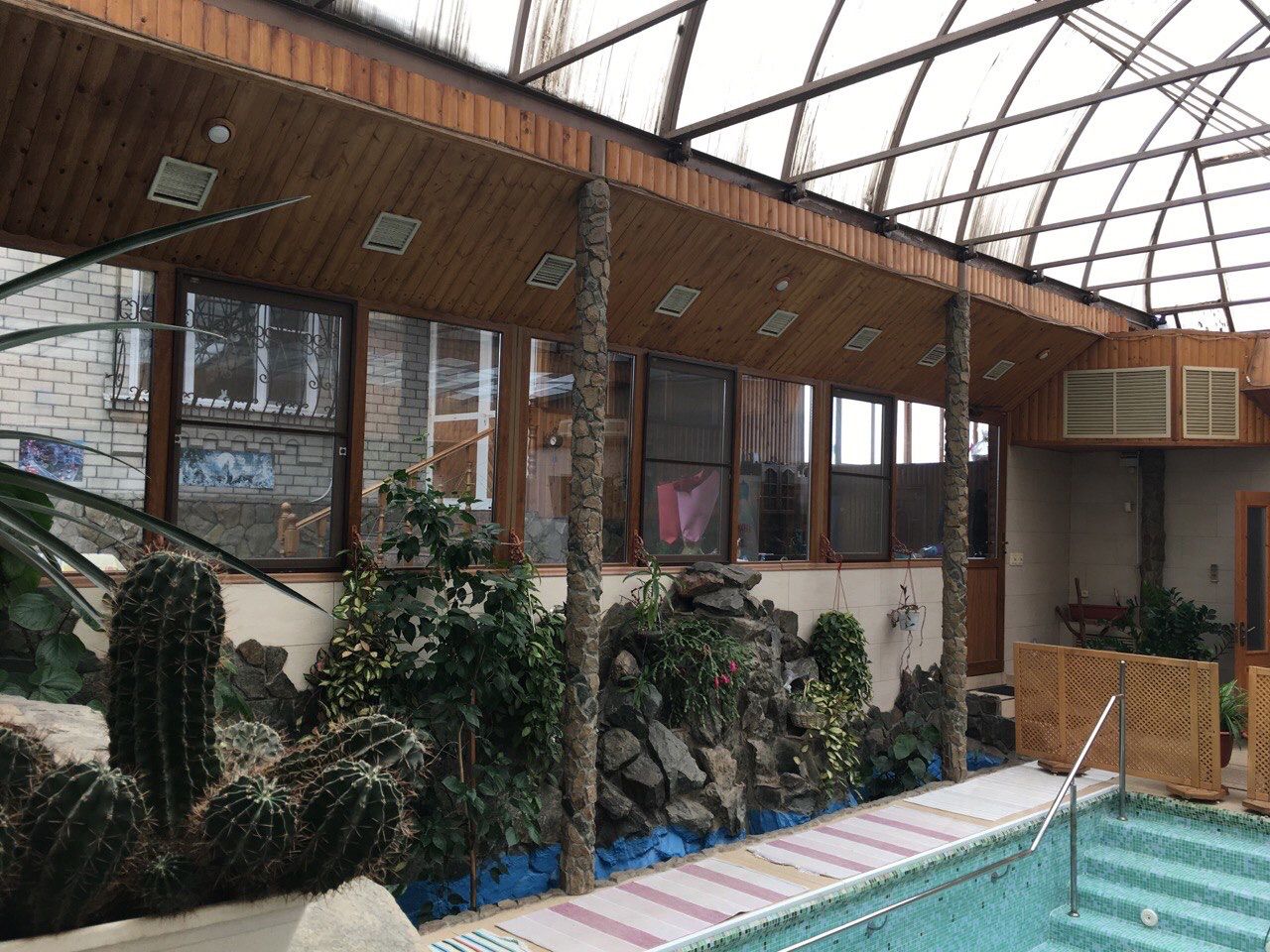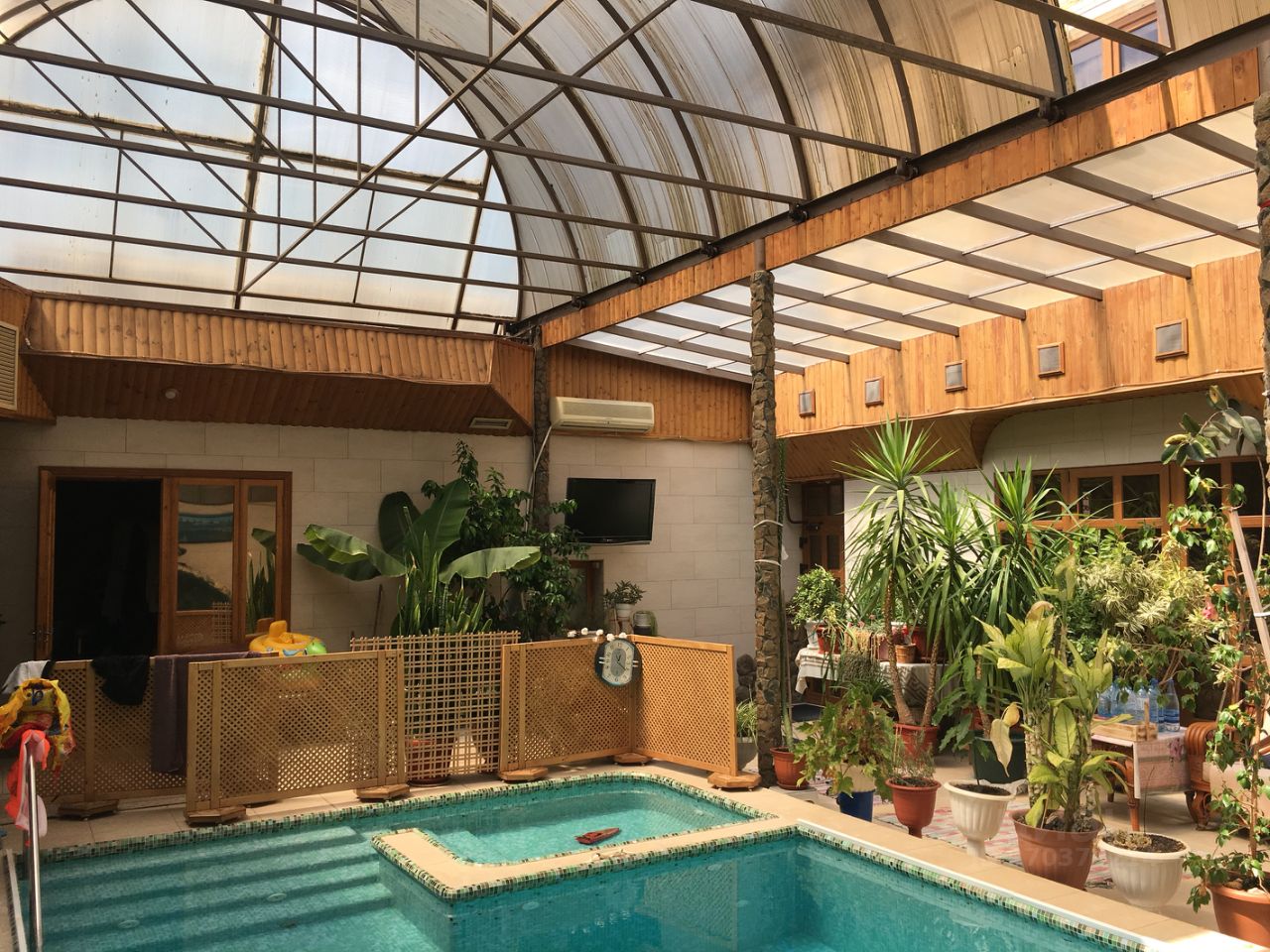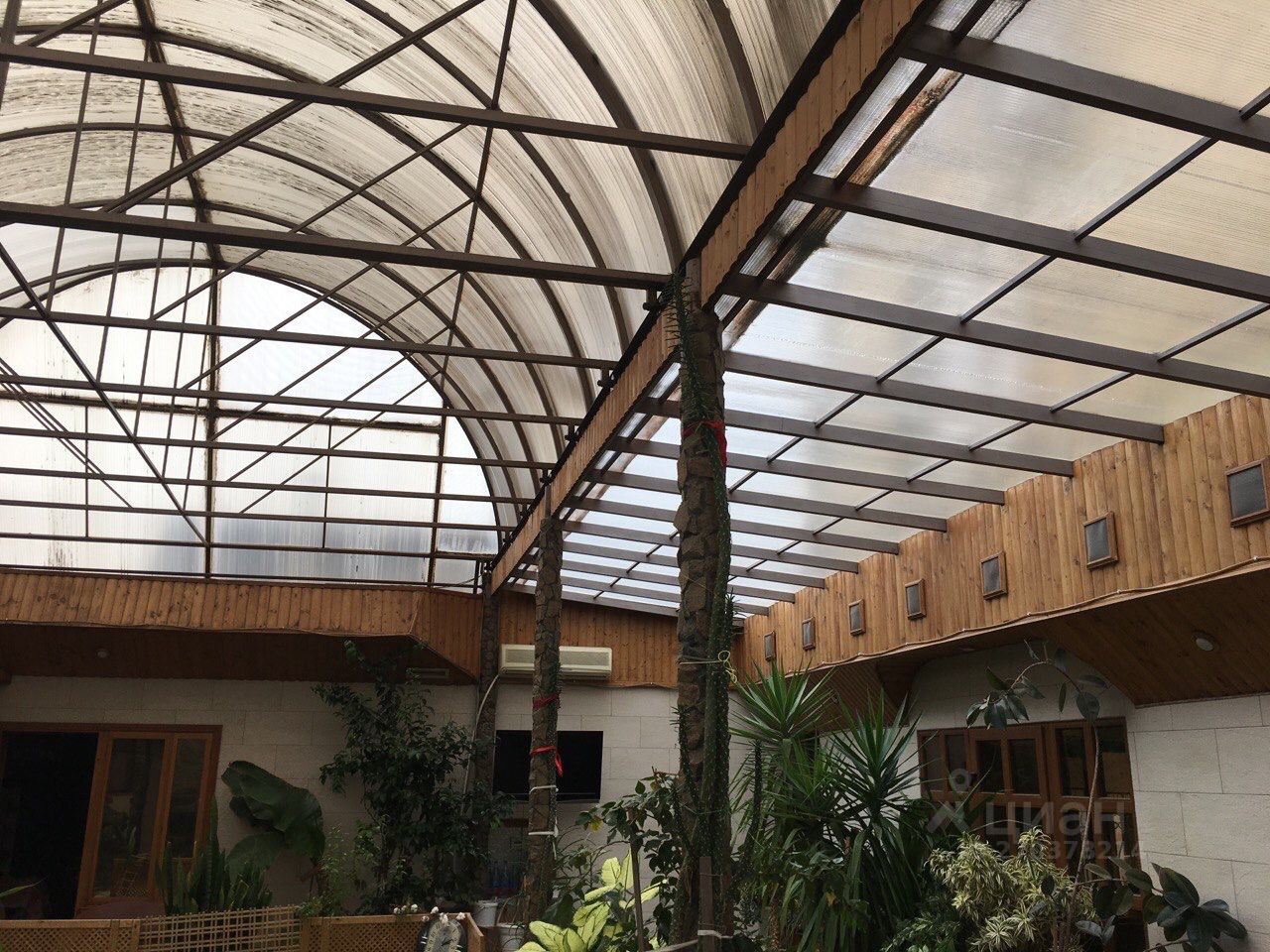 Два отдельных дома ,два отдельных входа, оба дома соединяет расположенный между ними крытый бассейн с оранжереей,и душевой комнатой