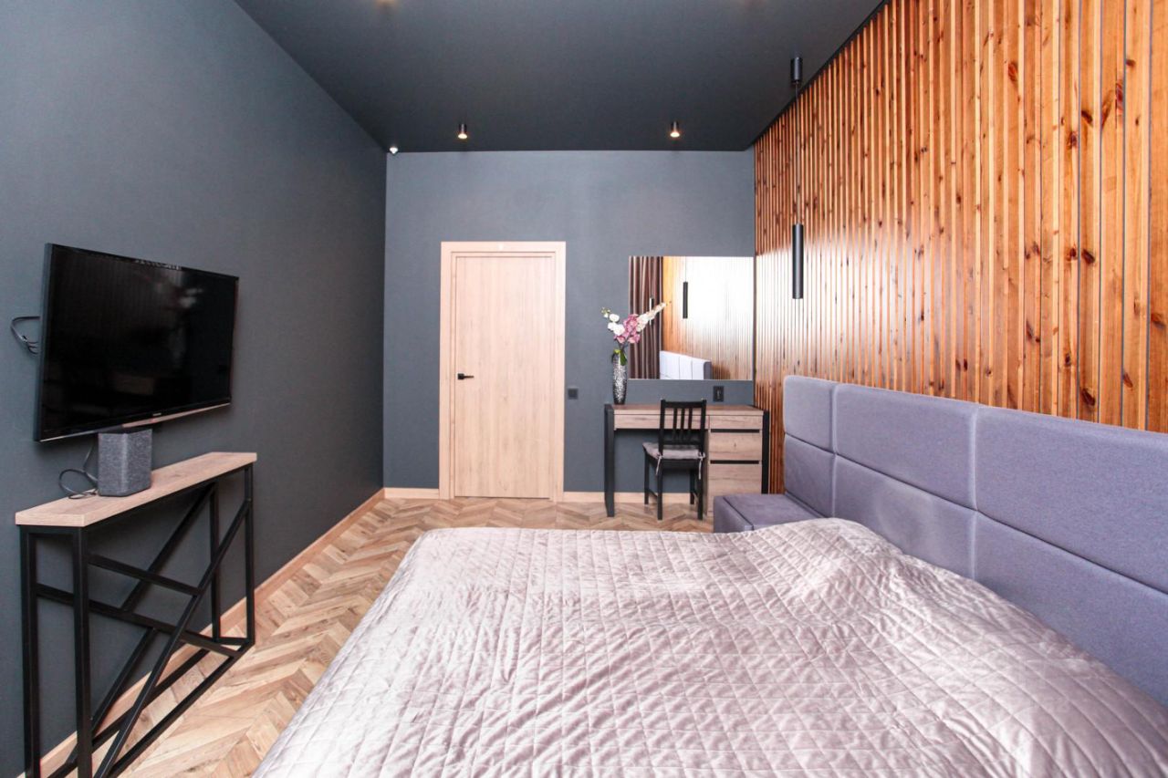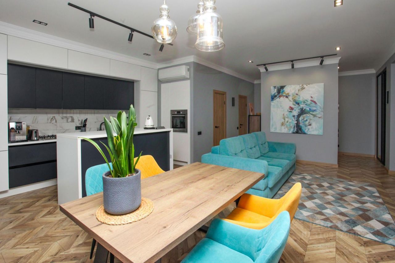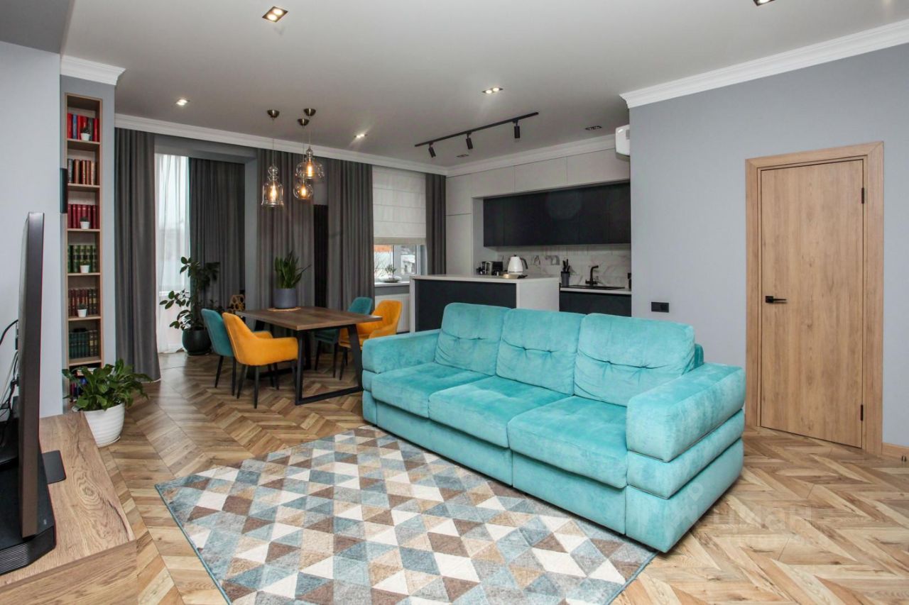 В квартире выполнен дизайнерский ремонт от архитектора Владимира Калабугина. Здесь идеально всё: * две изолированные спальни, * просторная кухня-гостиная площадью 33 кв. м, * жилая площадь - 53,5 кв. м.