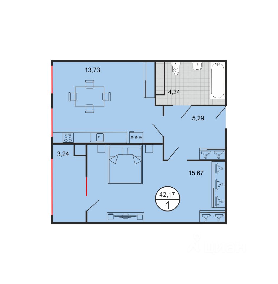 Общая площадь42,17 м2