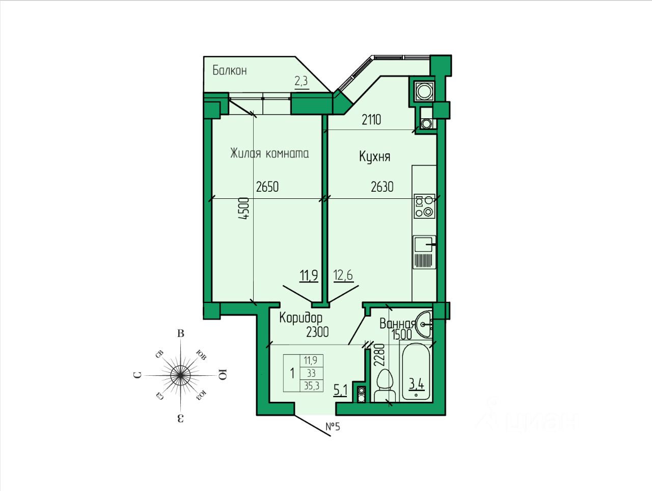 Общая площадь35,3 м2
