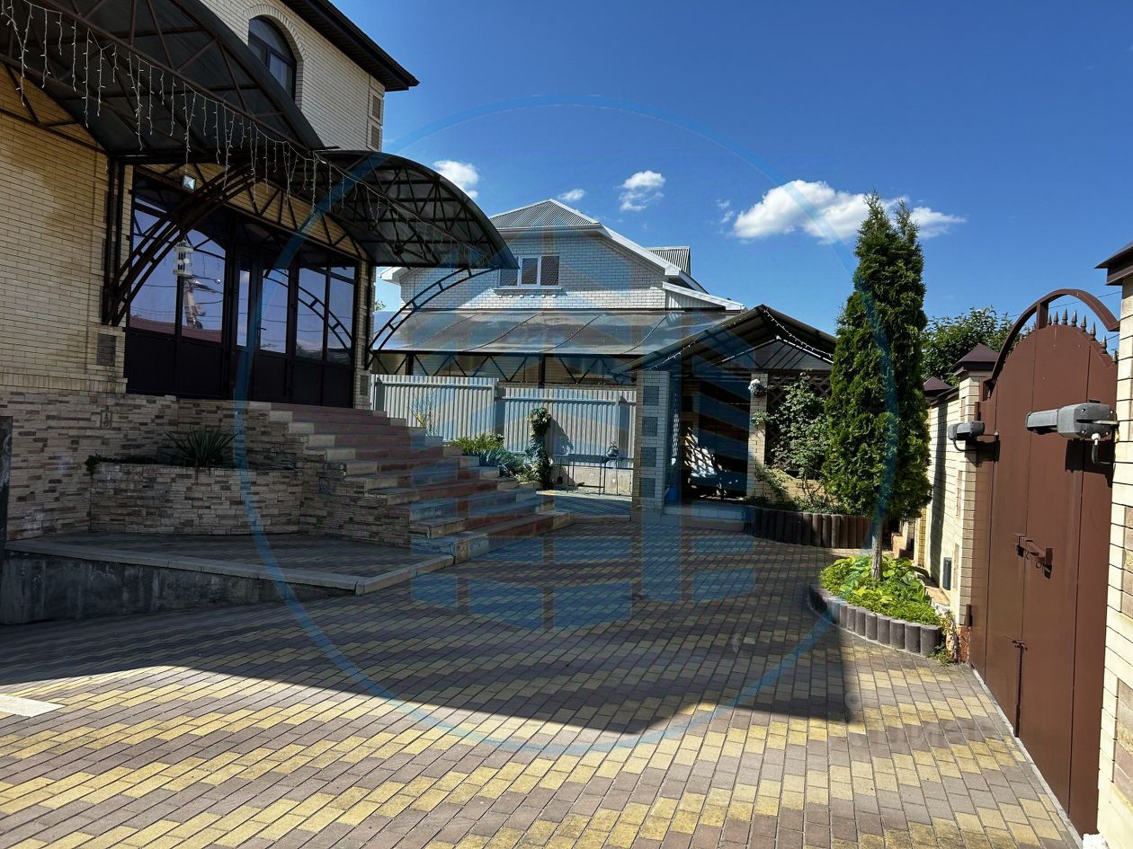 Дом и участок: Кирпичный дом, подземный гараж на два автомобиля, беседка и забор из кирпича, участок вымощен тротуарной плиткой.