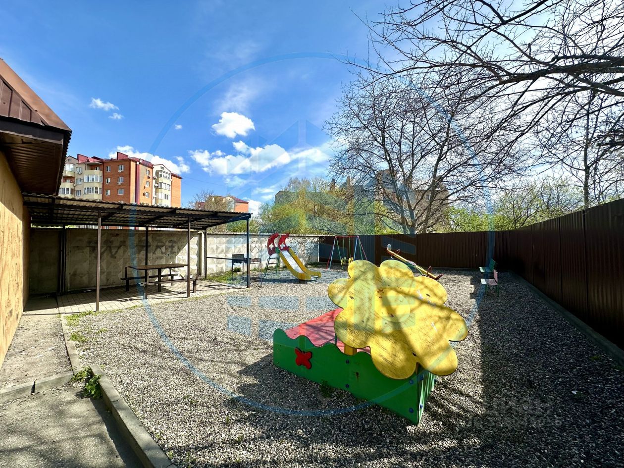 Кирпичный дом, благоустроенная территория, утопающая в зелени, детская площадка и достаточное количество мест парковки.