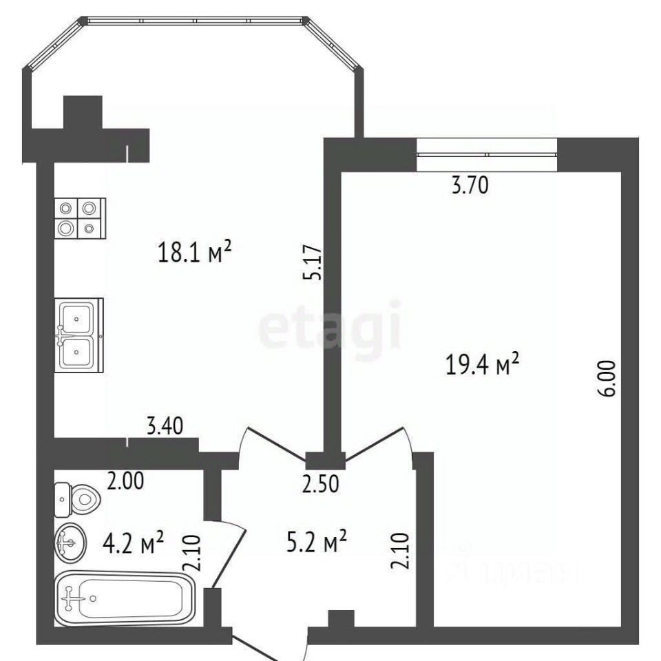 Основные характеристики: * Общая площадь: 46.9 кв. м. * Просторная кухня: 18 кв. м., оснащена панорамным окном. * Жилая комната: 19 кв. м. * Санузел: совмещенный.
