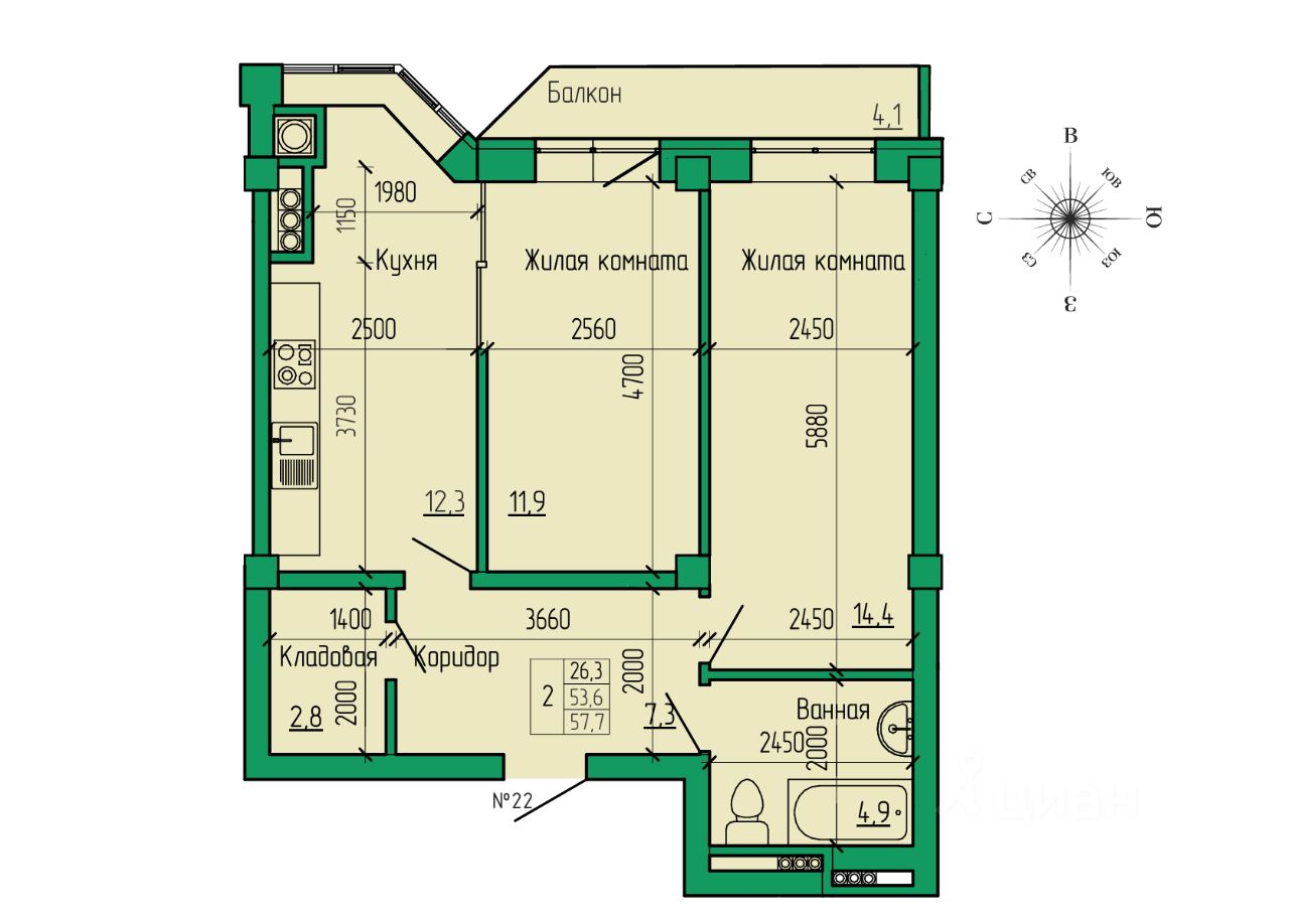 Общая площадь57,7 м2