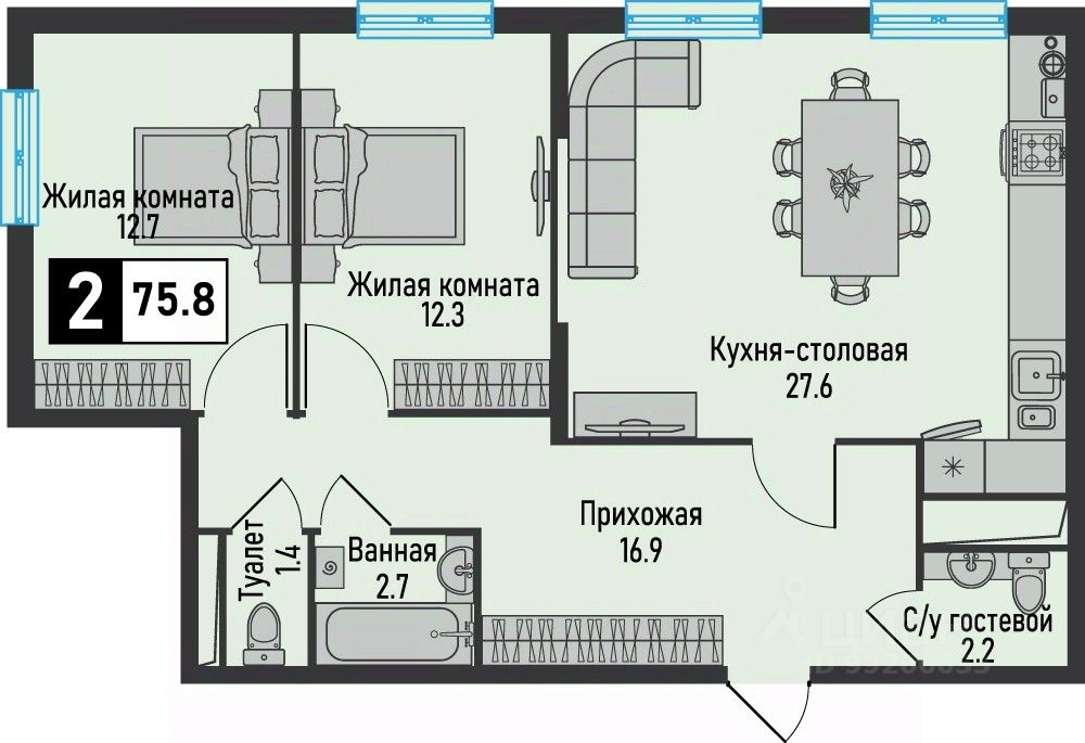 Продаётся 2-комнатная квартира в строящемся доме (7 очередь 1 этап), срок сдачи: III-кв. 2026, общей площадью 75.8 кв.м., на 1 этаже. Новый жилой комплекс ''Живописный'' расположен на территории Кавказских Минеральных Вод, рядом с основными курортными городами (Железноводск, Пятигорск, Ессентуки, Кисловодск) и горнолыжными курортами соседних республик. Насладиться головокружительными видами и активным отдыхом можно в соседних регионах: в Карачаево-Черкессии (на горнолыжных курортах Архыз и Домбай) или в Кабардино-Балкарии (в Приэльбрусье, побывав на г.Эльбрус). А из Международного аэропорта Минеральные Воды имени М. Ю. Лермонтова, расположенного в 20 минутах езды, можно улететь более чем по 30 внутренним и международным направлениям. ЖК ''Живописный'': Атмосфера: комплекс расположен в экологически чистом районе, органично вписываясь в окружающий ландшафт с колоритной природой и потрясающими видами.Отлаженная инфраструктура: образовательные учреждения, объекты здравоохранения, транспортные узлы, кафе и магазины находятся в шаговой доступности.Большой выбор квартир разной площади: улучшенные форматы квартир помогут воплотить в жизнь любые дизайнерские идеи и функциональные решения.Индивидуальное отопление позволит вам самостоятельно регулировать температурный режим, включать и отключать систему в любое время года.Проектом предусмотрены коммерческие помещения на первых этажах всех корпусов с целью развития и улучшения качества инфраструктуры. Для вашего удобства организованы наземная парковка и просторные кладовые помещения, вынесенные за пределы квартир.Придомовая территория включает благоустроенные зоны отдыха, детские игровые и воркаут-площадки. Огороженный двор и системы наблюдения обеспечат приватность и безопасность проживания.Более подорбную информацию о строительстве жилого комплека можно узнать на сайте застройщика
