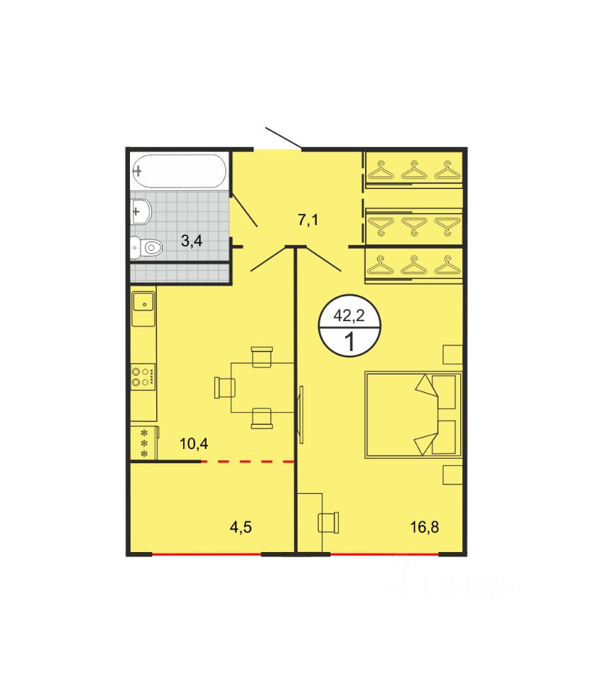 Общая площадь42,2 м2