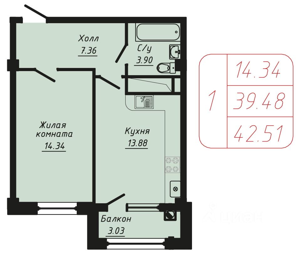 Продаётся 1-комнатная квартира в строящемся доме (Секции 6-10), срок сдачи: II-кв. 2028, общей площадью 42.51 кв.м., на 6 этаже.