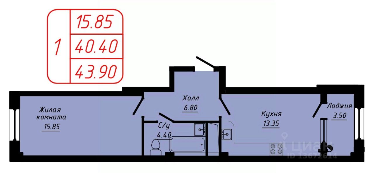 Продаётся 1-комнатная квартира в строящемся доме (3 этап), срок сдачи: III-кв. 2027, общей площадью 43.9 кв.м., на 2 этаже.