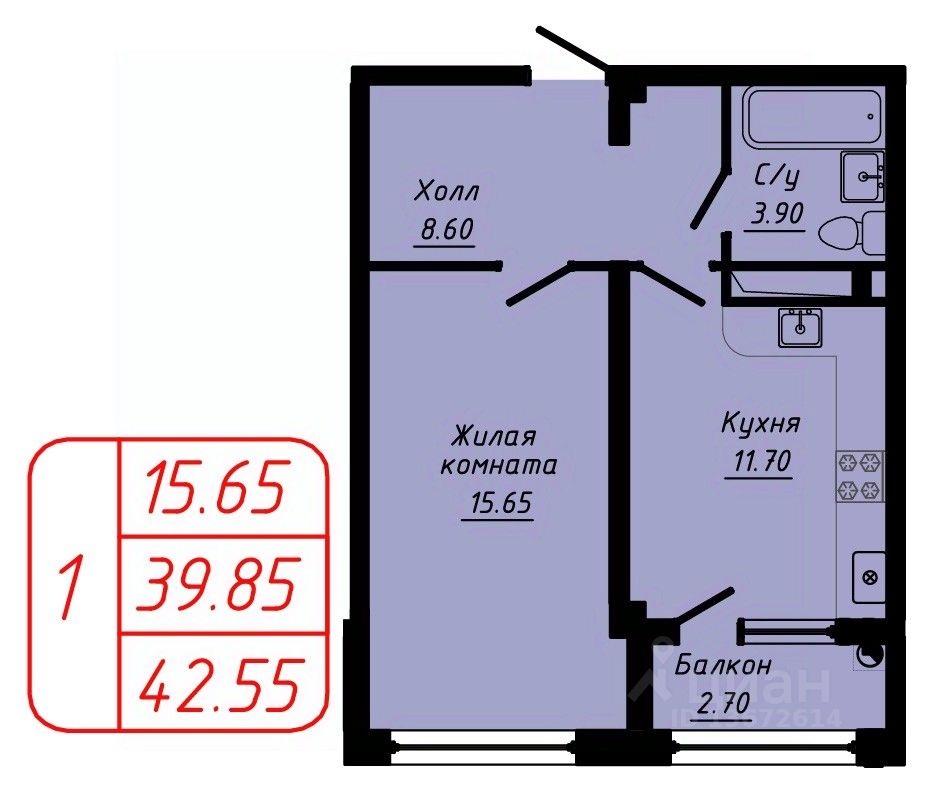Продаётся 1-комнатная квартира в строящемся доме (3 этап), срок сдачи: III-кв. 2027, общей площадью 42.55 кв.м., на 3 этаже.