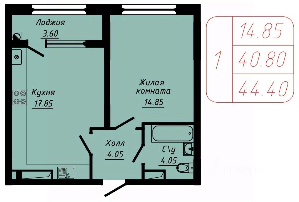 Продаётся 1-комнатная квартира в строящемся доме (3 этап), срок сдачи: III-кв. 2027, общей площадью 44.4 кв.м., на 1 этаже.