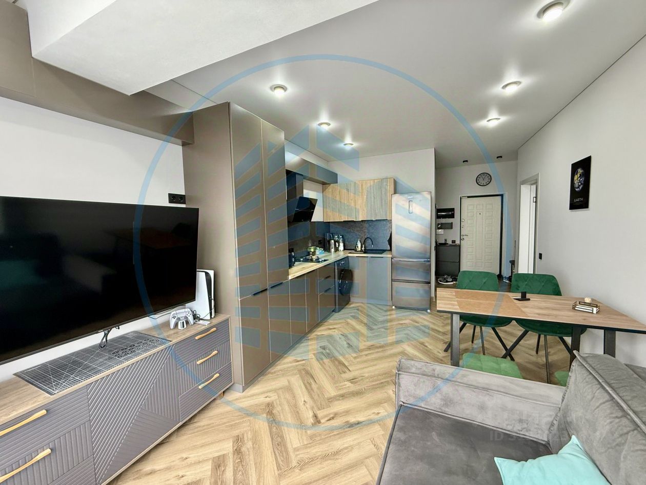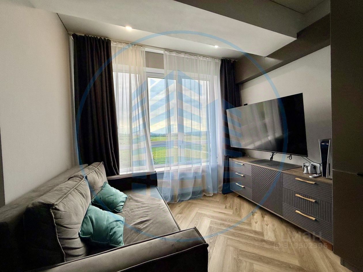 Современная планировка: просторная кухня-гостиная, изолированная спальня с гардеробной, сан/узел, Панорамные окна с великолепным видом на горы, Новый дизайнерский ремонт: керамогранит, ламинат, обои на стенах, натяжные потолки с точечным освещением, частично остается мебель и техника, Индивидуальное отопление, Интернет, Охранная сигнализация.