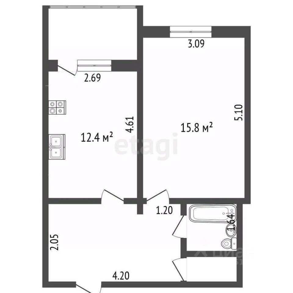2. *Кухня (или кухня-ниша):* - Отдельная кухня 12.4 м². - Вмещает необходимую технику (плита, холодильник, мойка) и обеденный стол