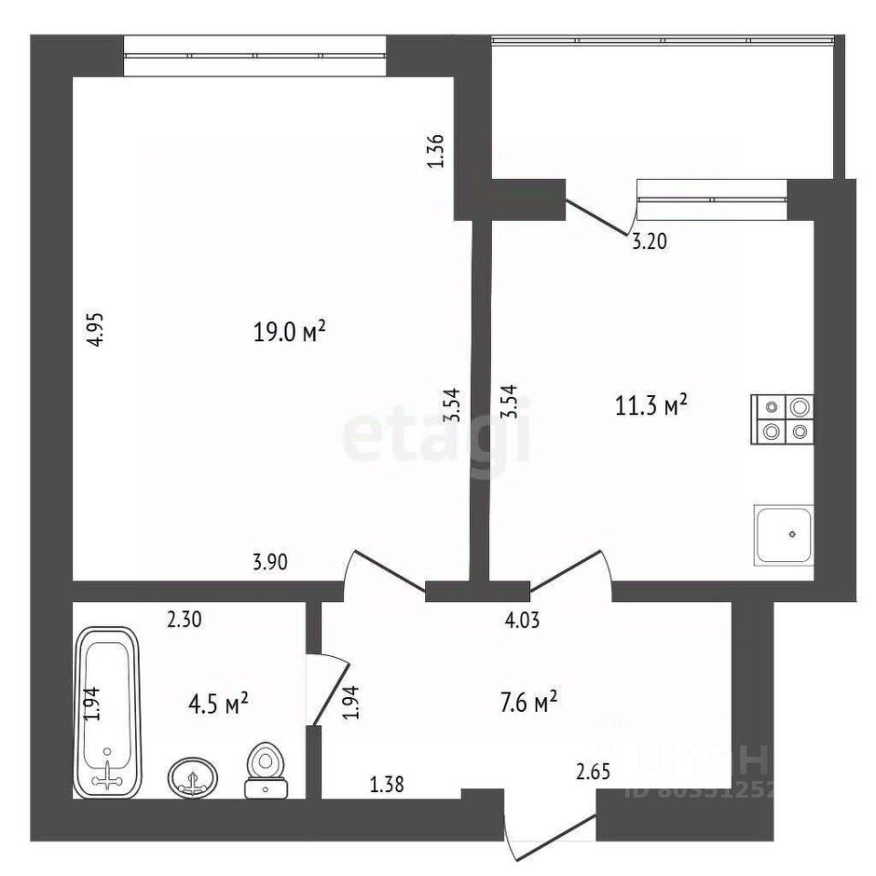 Отличная планировка: большая кухня 11.3 м², уютная комната и застекленная лоджия 4.1 м².