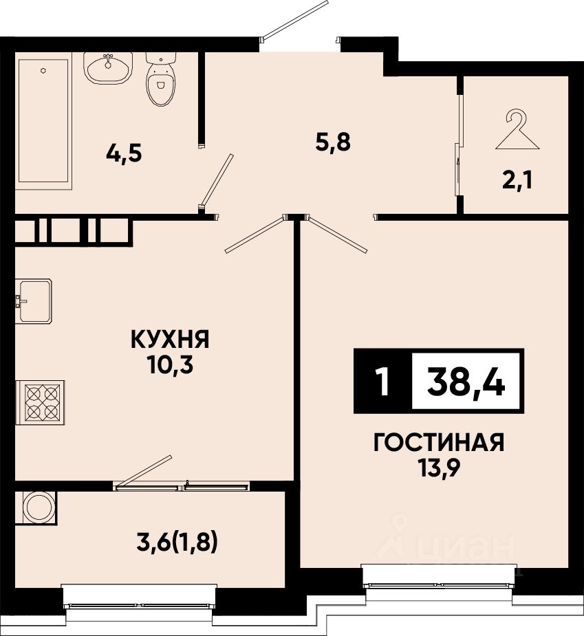 Общая площадь38,4 м2