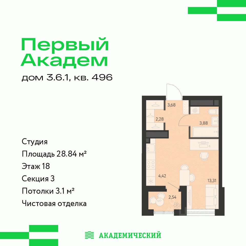 Продается студия площадью 28.84 кв.м. от девелопера ''Академический'' в жилом квартале ''Первый Академ''. Срок сдачи дома в 2026 году. Выгоды и скидка напрямую от застройщика.