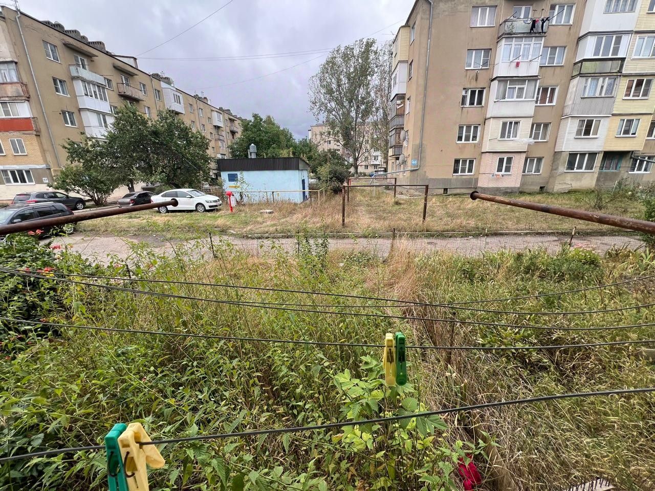 Балкон, первый высокий этаж, за окном есть навес и полисадник.