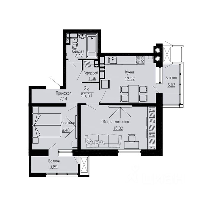 Общая площадь56,61 м2