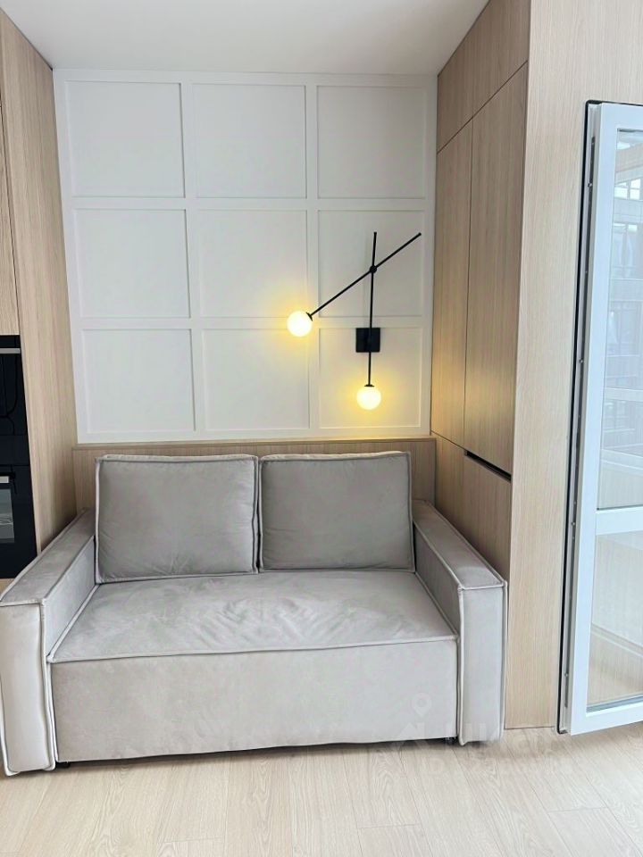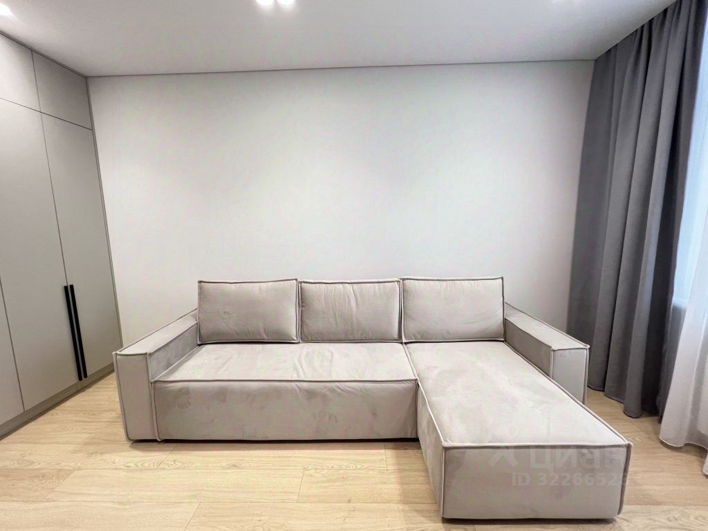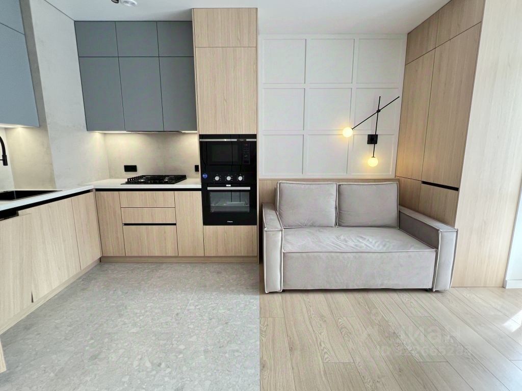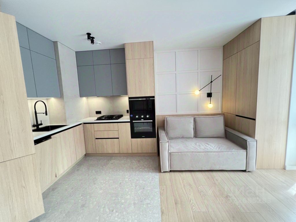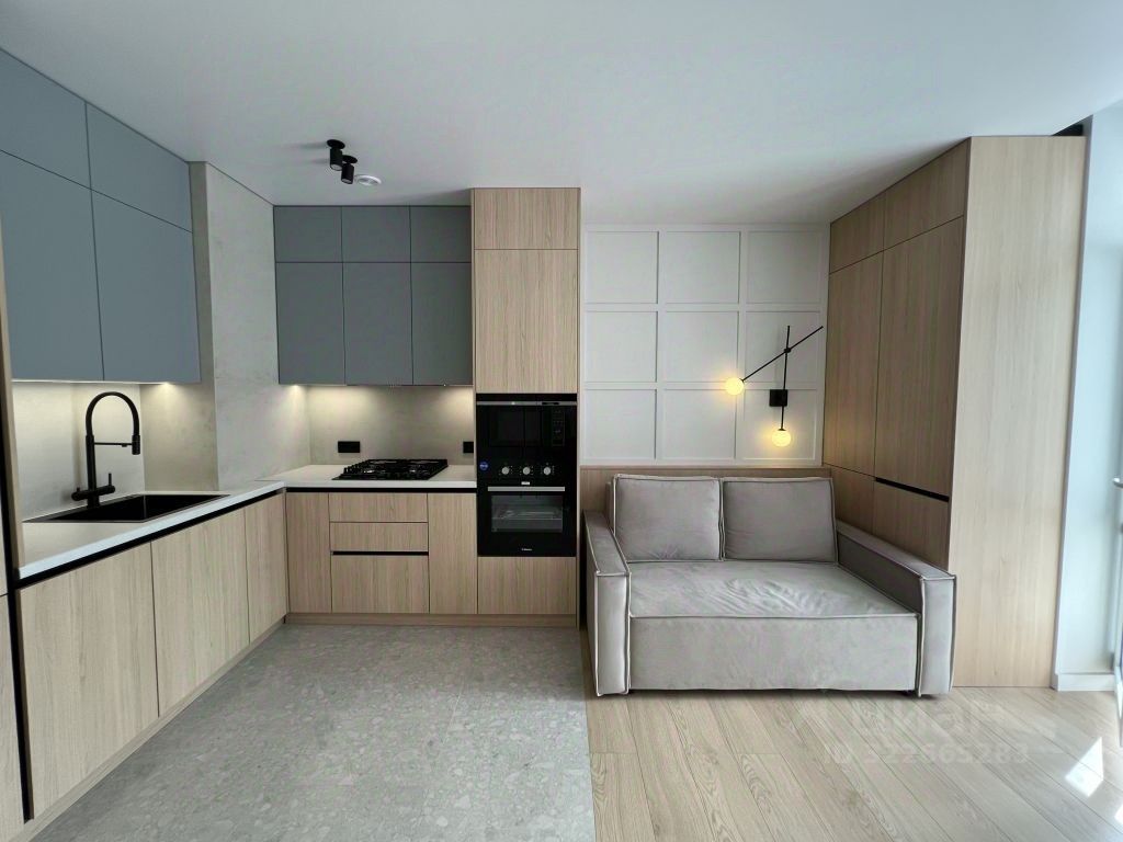 Встроенная мебель плюс техника на кухне. Много мест для хранения. Стильный угловой диван в прихожей, а в спальне кровать с мягким изголовьем.