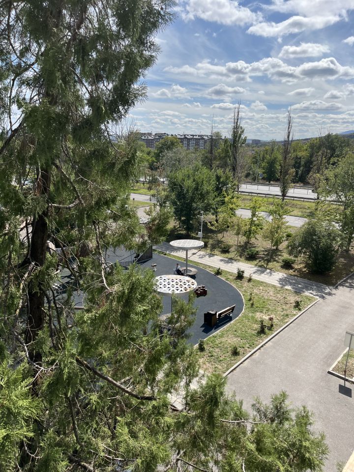 Дом расположен в спокойном, обустроеном районе. Окна квартиры выходят в ухоженный зелёный двор с детской площадкой. Рядом парк.