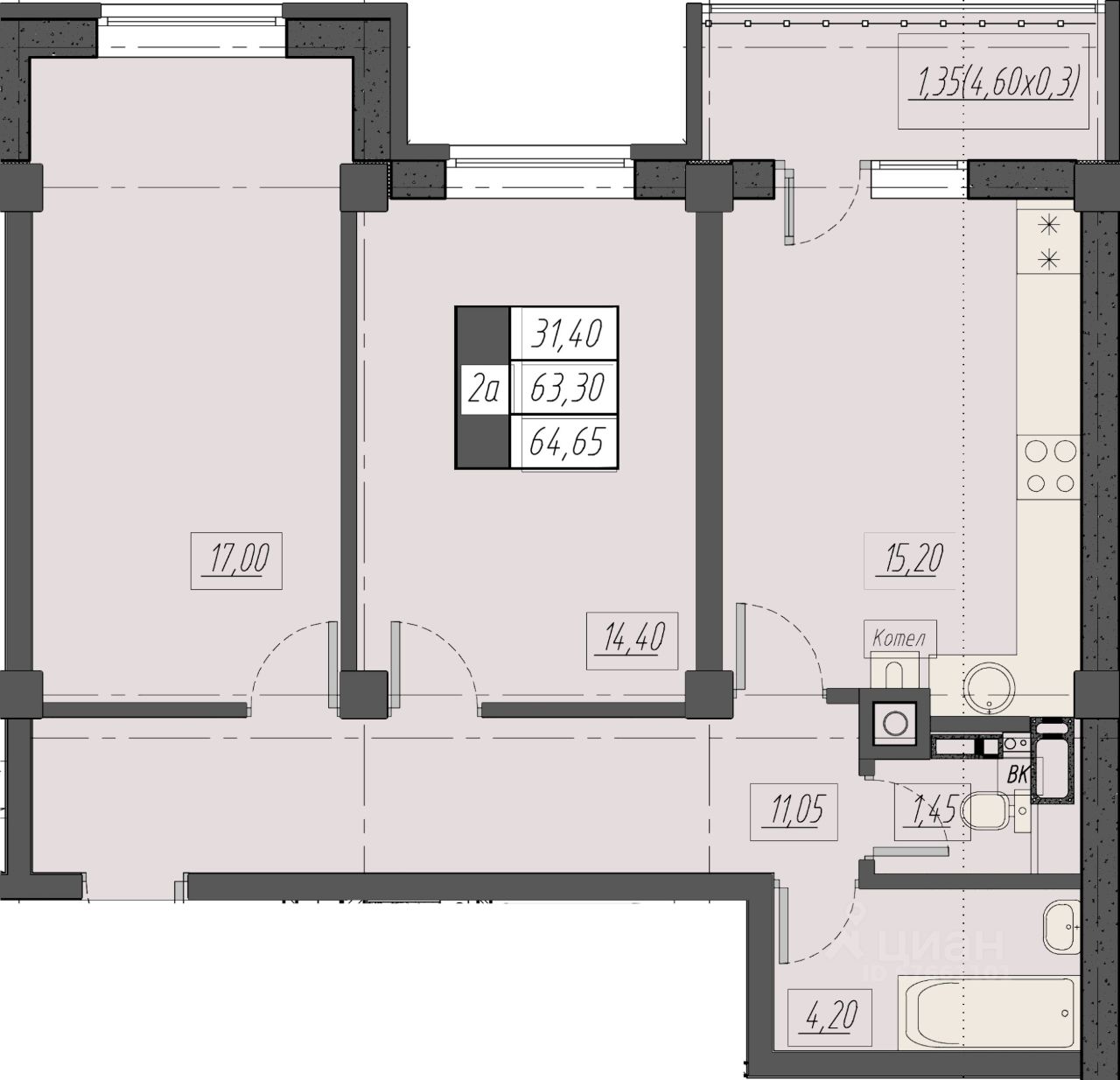 Общая площадь64,65 м2