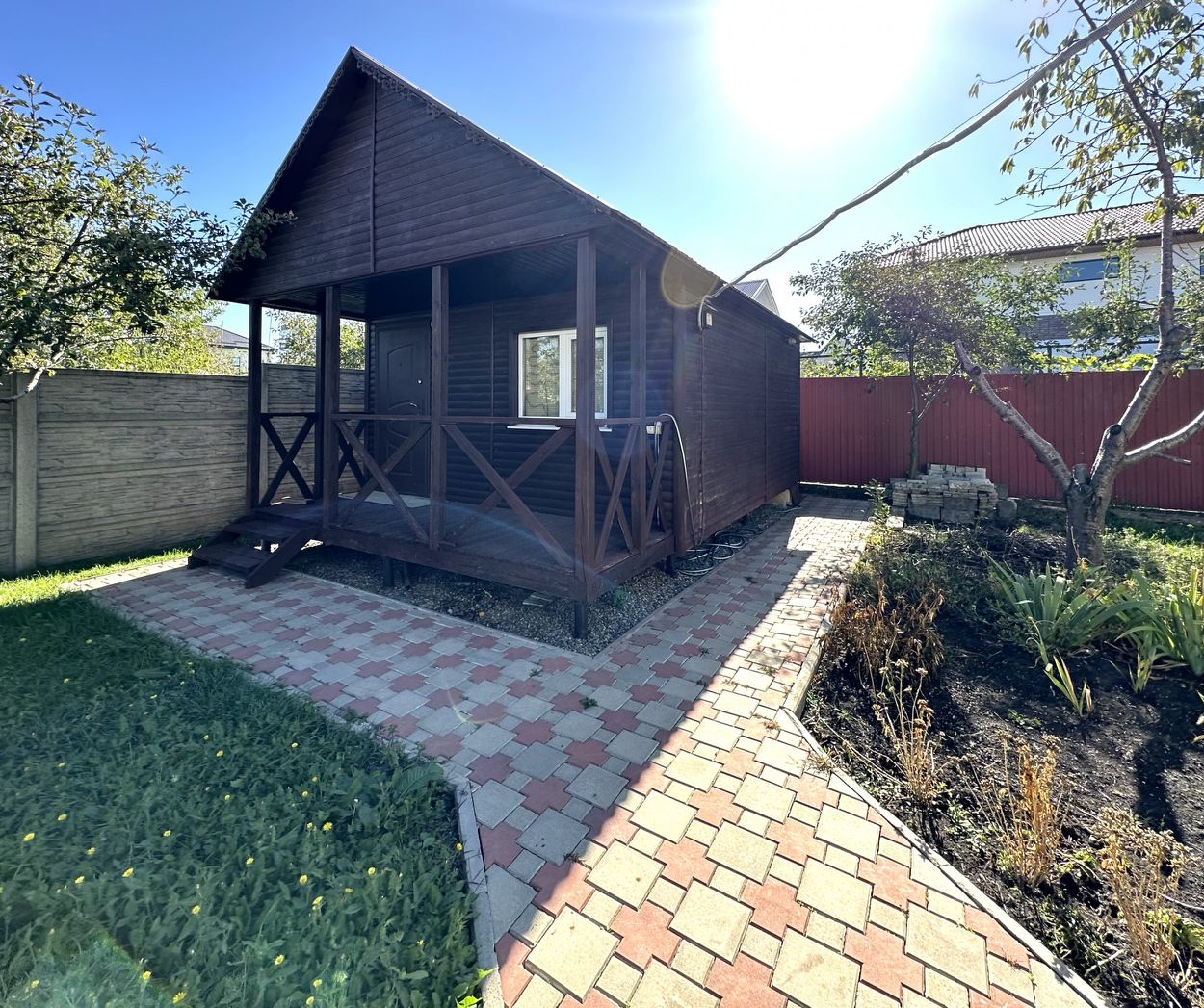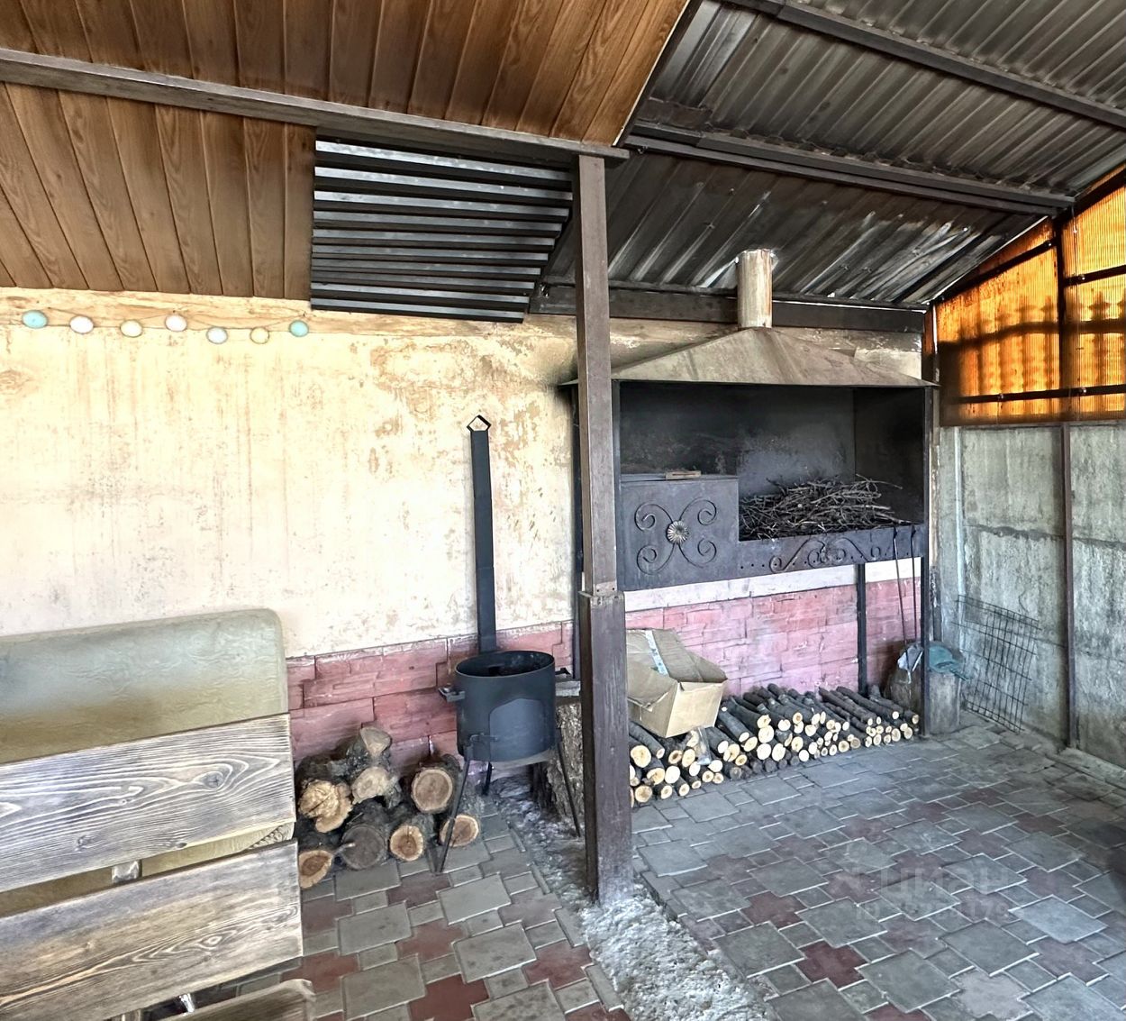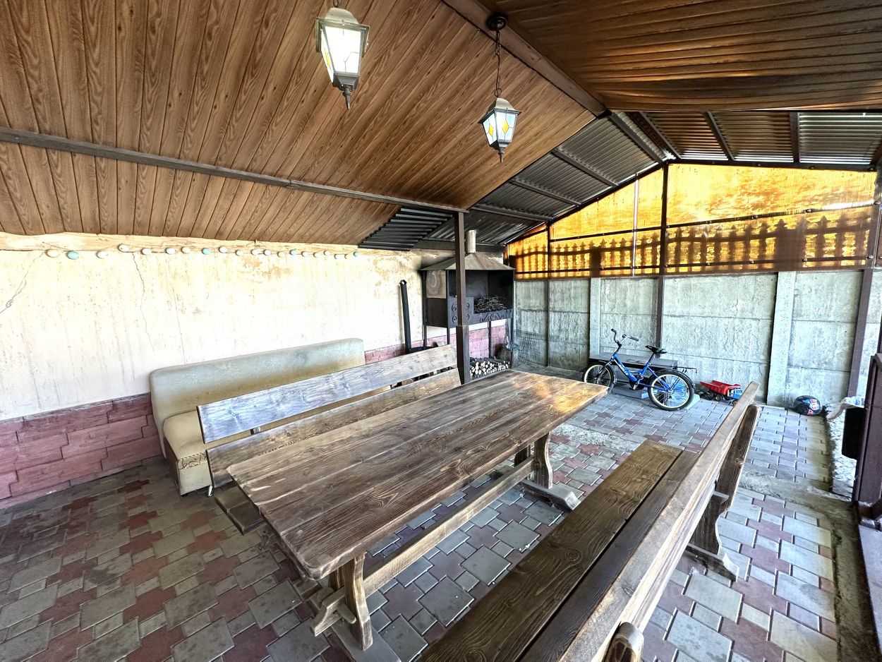 Надежный дом на большом участке земли, с навесом и мангальной зоной. Имеется баня из дерева, сад и огород.