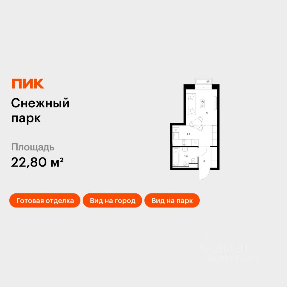 Продаётся квартира-студия площадью 22,8 кв.м на 21 этаже 25 этажного дома (Корпус 4, Секция 2) проекта ПИК Снежный парк. Светлый просторный подъезд на уровне земли, функциональная планировка, большие окна, c отделкой.