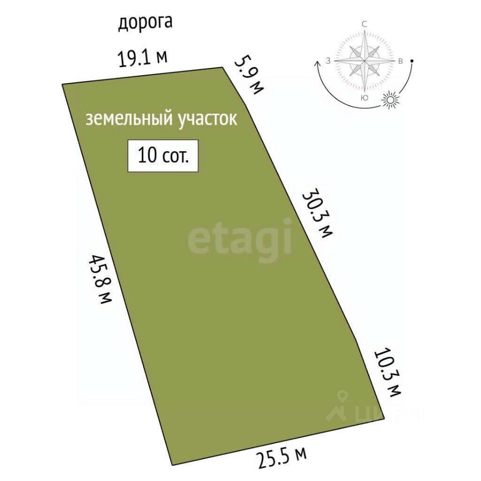 Участок размером 10 сот.- в собственности, правильной формы.