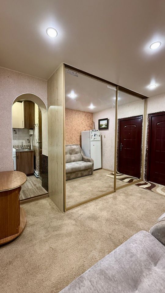 Отделка: ковролин в жилой зоне, плитка в кухне и санузле