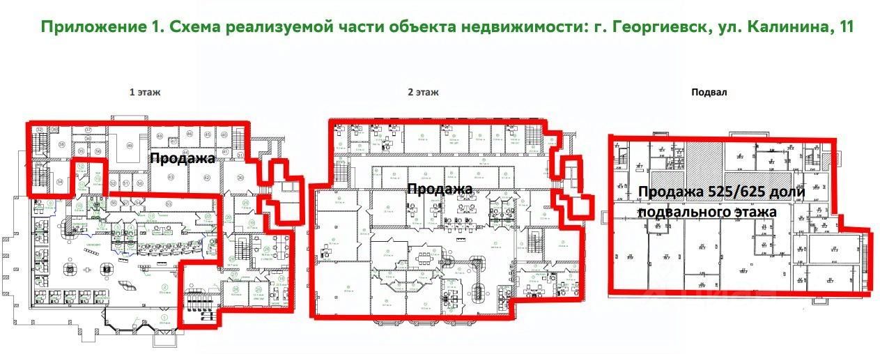 Сбер А предлагает к реализации часть здания ориентировочной площадью 2005,1 кв.м. (необособленное помещение), 525/625 доли подвального этажа площадью 984,4 кв. м. (необособленное помещение), нежилого здания площадью 69,4 кв.м., доли в размере 29014/36324 земельного участка площадью 2956,0 кв. м, расположенных по адресу: Ставропольский край, г. Георгиевск, ул. Калинина 11