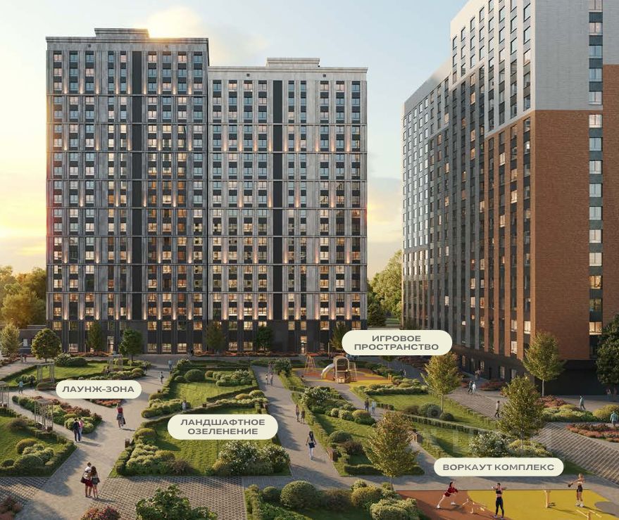 •Воркаут-площадка, современные тренажеры, детская площадка, лаунж-зоны