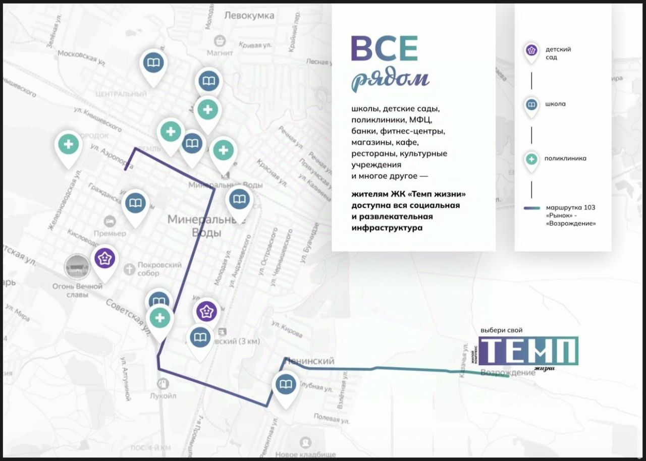 Ключевые преимущества: Все участки в собственности Коммуникации - свет уже подведён в 1-й и 2-й очередях Газоснабжение - итоговая стадия работ Транспорт - асфальтированный подъезд к ЖК и автобусная остановка (маршрут 103) до центра Мин-вод