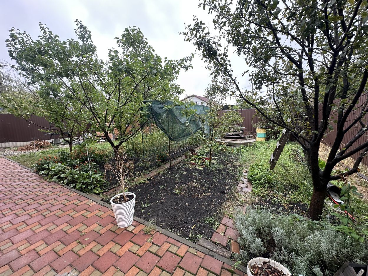 Двор просторный, выложен тратуарной плиткой, парковка на 4 машины. Автоматические ворота, видеонаблюдение, домофон. Весь участок огорожен забором, имеется хороший сад, огород, клумбы с декоративными растениями.