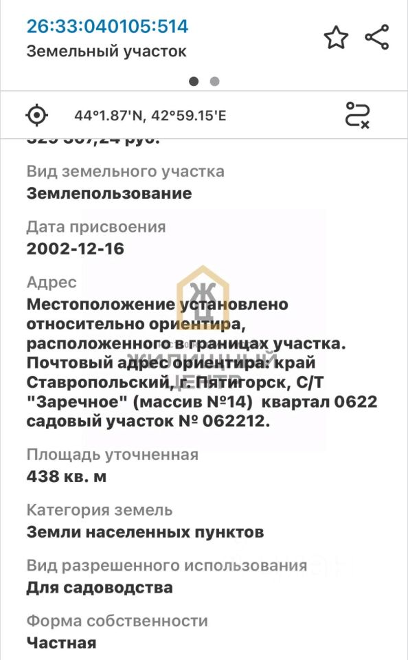 Арт. 90959501. Продам земельный участок, 4.38 сотки, в собственности, угловой, ровный(относится к Пятигорску).