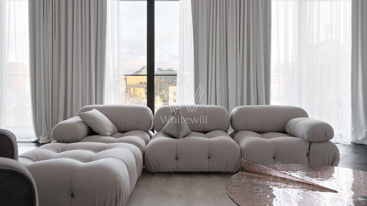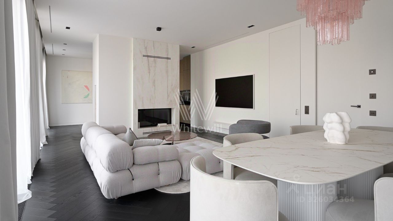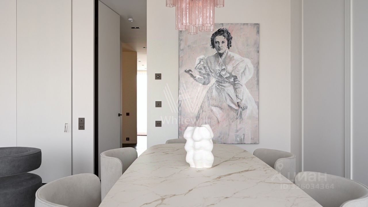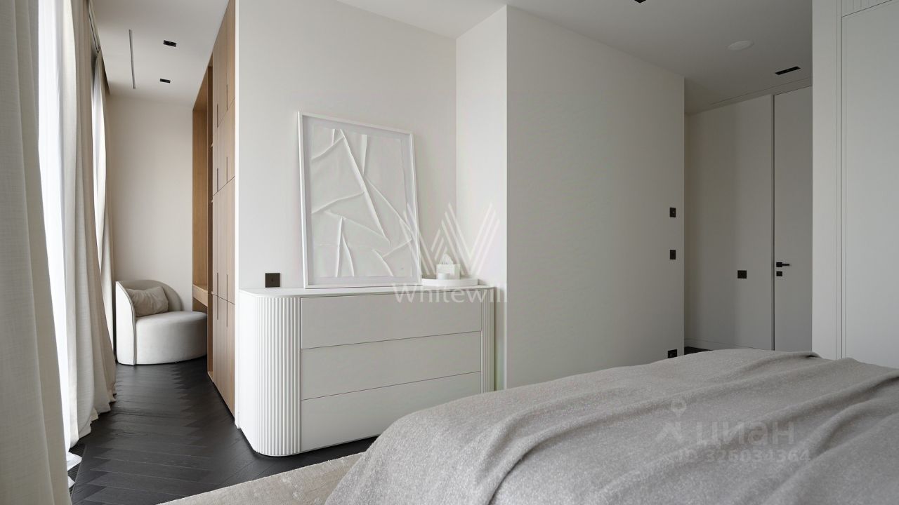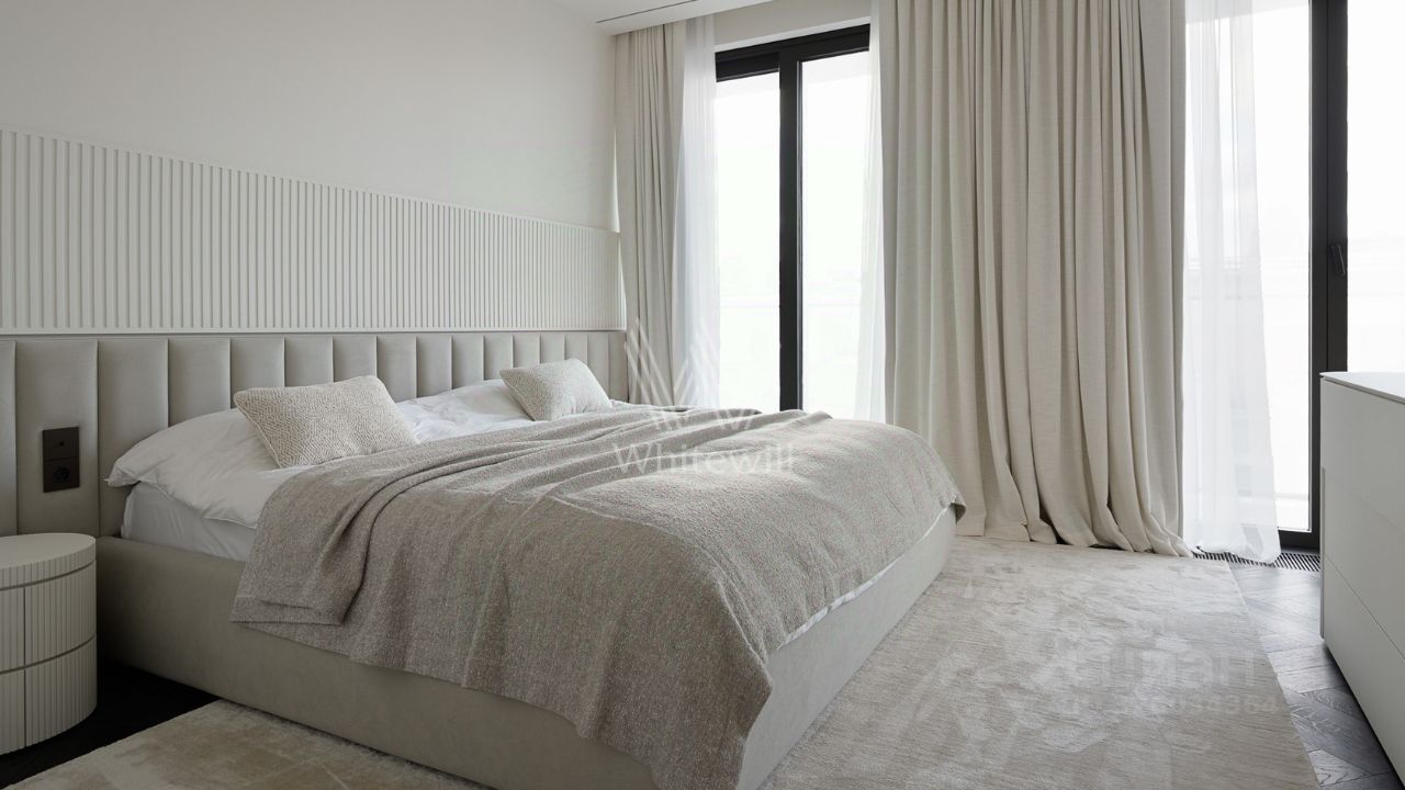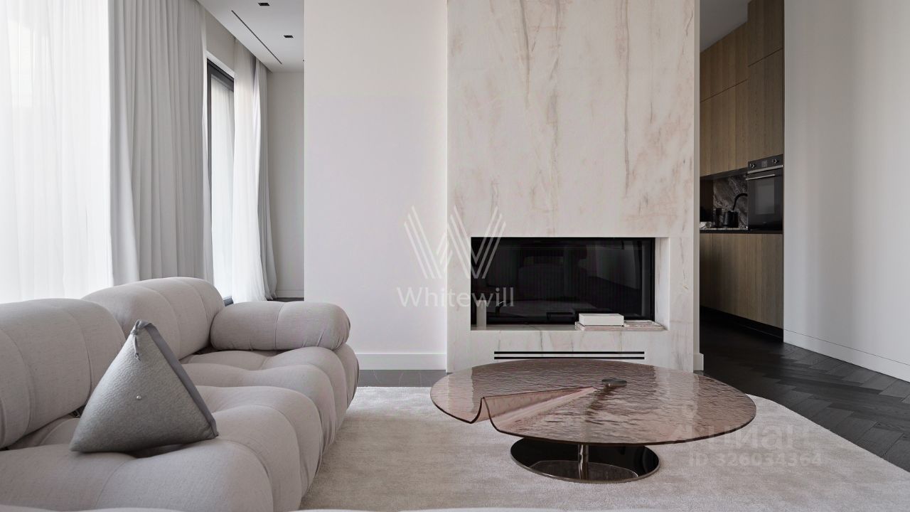 Спланирована кухня-гостиная с камином, мастер-спальня с ванной комнатой и рабочей зоной, 2 спальни со своими санузлами, гостевой санузел, гардеробная, постирочная, прихожая. Квартира полностью меблирована и оборудована встроенной бытовой техникой. Квартира оснащена системой ''умный дом'', приточно-вытяжной вентиляцией с двухступенчатой очисткой воздуха, системой фильтрации воды до уровня родниковой. В стоимость входит машино-место в подземном паркинге.