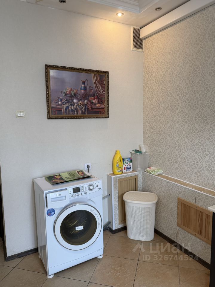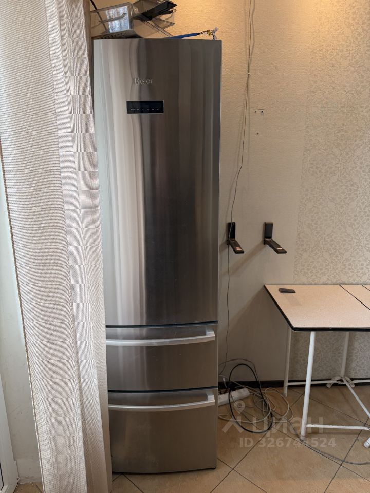 Кухня оборудована техникой: холодильник, плита и стиральная машина.