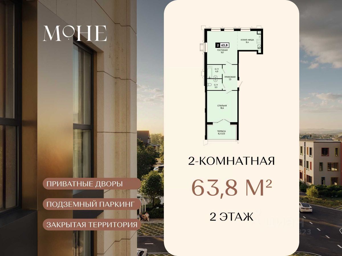Закрытая территория с низкой плотностью застройки — максимум приватности. Собственный сквер 0,5 га: более 15 видов растений, зоны отдыха, натуральные материалы. Приватные дворы-патио — всегда тихо. Собственный детский сад. Подземный паркинг, отсутствие машин во дворах. Авторская архитектура: травертин, латунь, премиальная эстетика.