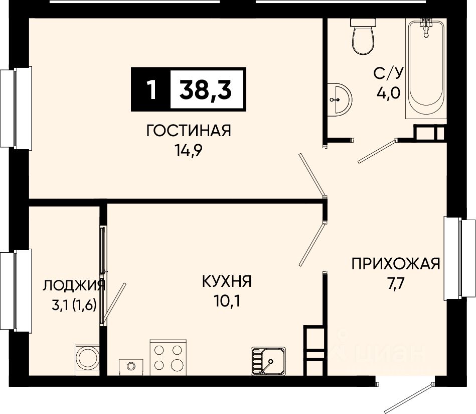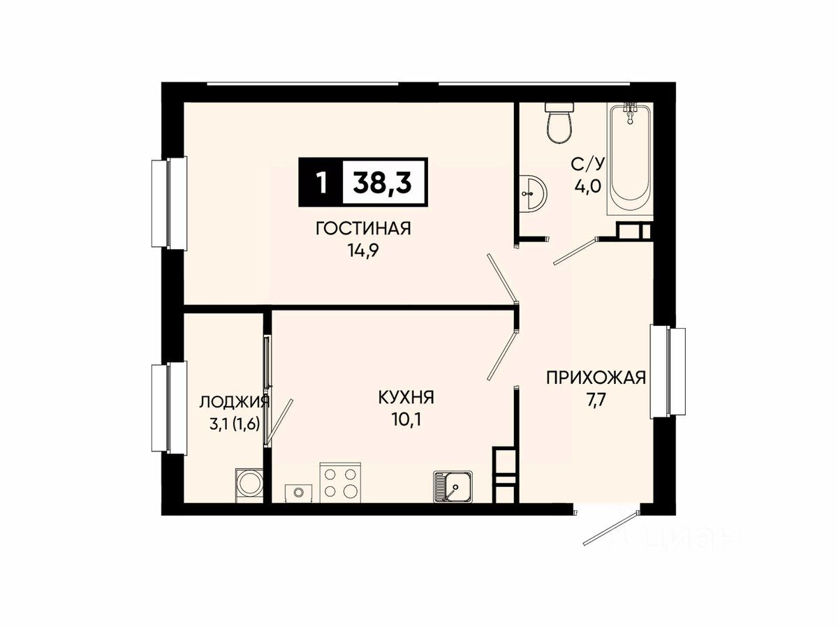 Общая площадь38,3 м2