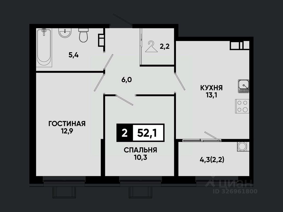 Общая площадь52,1 м2