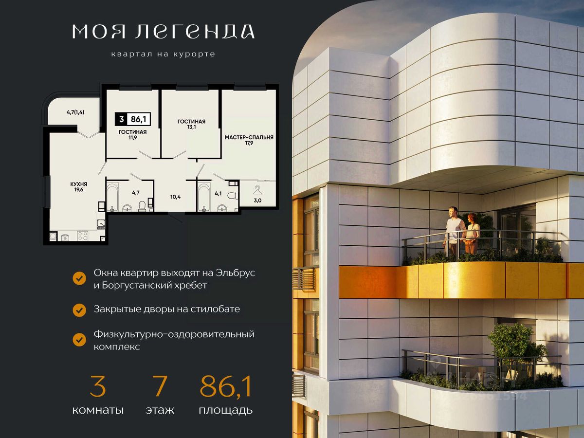 ЖК ''Моя Легенда'' — курортная недвижимость премиум-класса: — 21 дом переменной этажности (914 этажей) на территории более 15 га, — Закрытые дворы на стилобате с концепцией ''без машин'', детские и спортивные зоны, лаунж-зоны, — Подземный и наземный паркинг, парковка по цене квартиры и рассрочка 0%, — Холлы с дизайнерской отделкой, стеклянные двери, керамогранит премиум-класса и подсветка, — Коммерческие помещения на стилобате — магазины, кафе, салоны красоты, — Собственный детский сад и физкультурно-оздоровительный комплекс на территории.