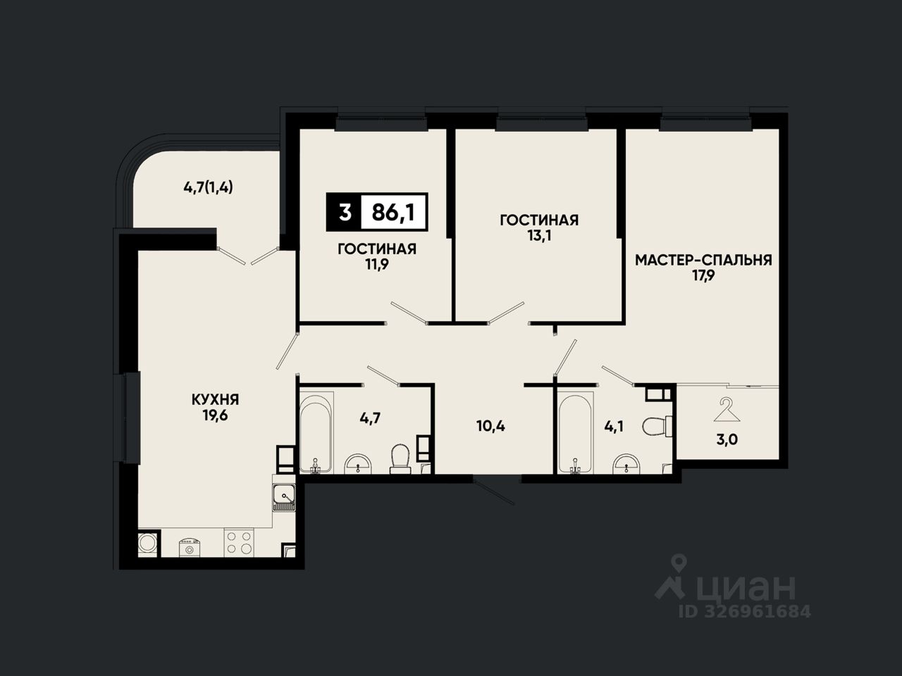 Общая площадь86,1 м2