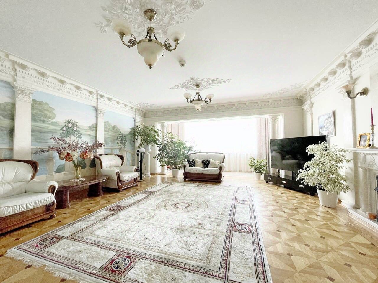 Просторная гостиная с авторскими фресками на стенах и камином,